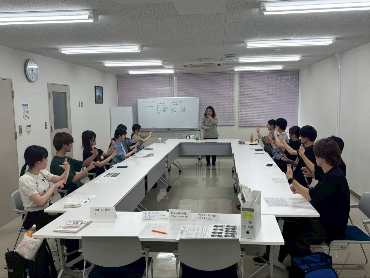 活動内容:手話を用いたコミュニケーションの基礎練習、日常会話表現の学習、簡単な自己紹介や挨拶の練習を中心に活動しています。月に2回、手話の講師の先生にお越しいただき、活動しています。
